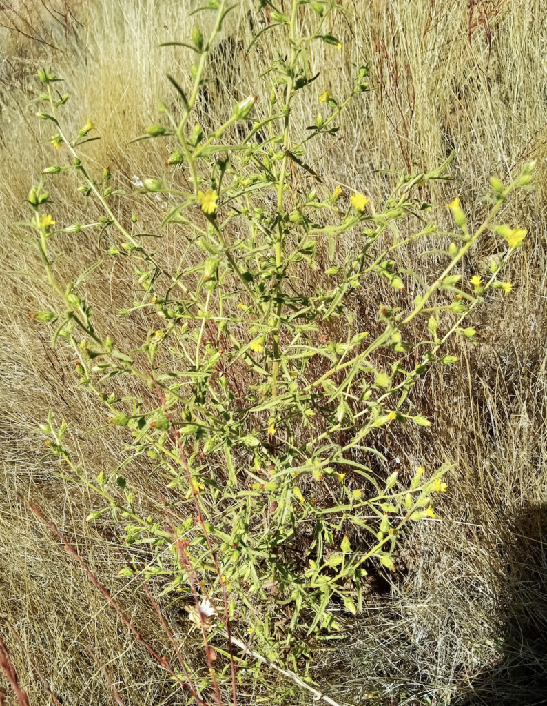 Stinkwort is a fairly new invasive plant in California in the sunflower family that grows up to three feet tall with tiny heads of yellow flowers that bloom in the fall and when in seed, form a tufted head somewhat like a miniature dandelion. The stems and leaves are sticky and have a strong unpleasant smell and it can cause dermatitis although not as bad as poison oak.