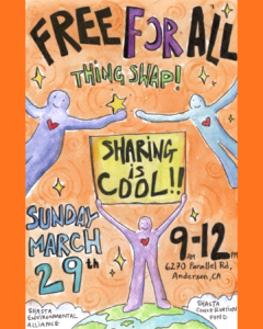 Join the Shasta Environmental Alliance and the Western Shasta Resource Conservation District for a lively “Free for All ~ Thing Swap”—a morning of sharing, treasure‑hunting, and community connection. Bring gently used items you no longer need, set them out for others to enjoy, and browse the tables to see what useful or delightful things you might take home.