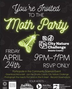 Attract and photograph moths and other insect species to record for the Shasta County City Nature Challenge.