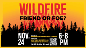 Shasta Environmental Alliance invites you to a free presentation about California’s relationship to fire on November 24, 2025. Kalyn Nash from Western Shasta Resource Conservation District will take us on a journey through California’s historic fire regimes, the ecological need for fire, and the ways in which humans impact these fire regimes. The second part of the presentation will be covered by members from Native Roots Network to teach us about the Indigenous relationship to fire and the cultural and ecological significance of Native burning practices. The discussion will wrap up with home hardening suggestions and the opportunity to ask questions. We hope you will join us in this opportunity to have a deeper understanding of living with wildfire.